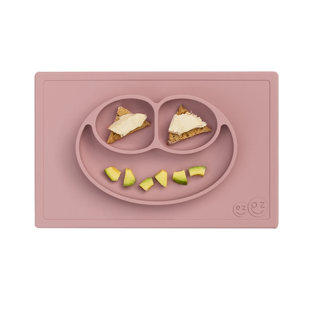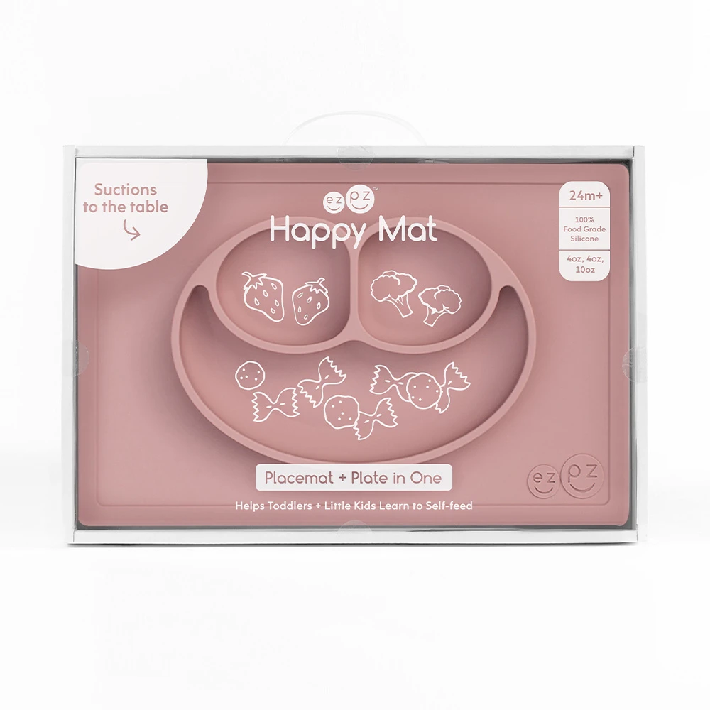 Happy Mat es el producto estrella galardonado de ezpz. Es un mantel individual + plato todo en uno que succiona hacia la mesa, lo que significa que captura el desorden y reduce los tazones y platos caídos. Diseñado para niños pequeños y preescolares.