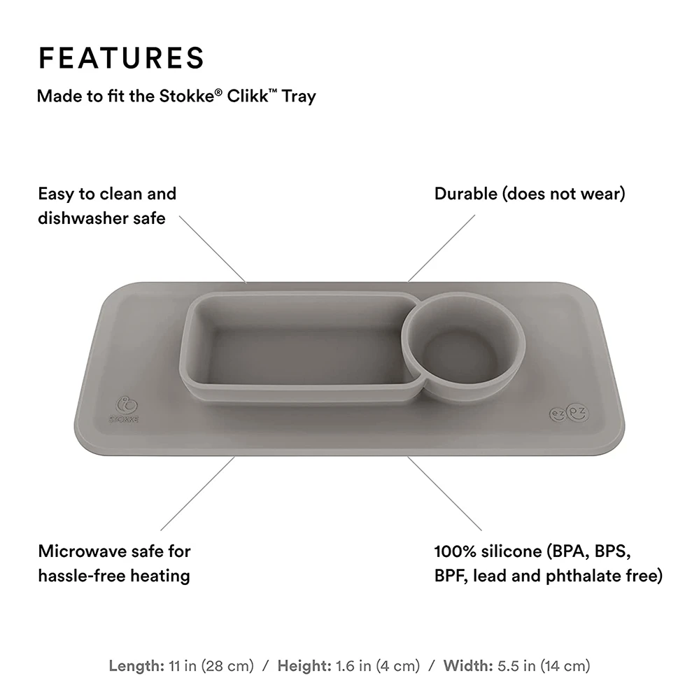 El mantel individual ezpz™ de Stokke™ para la bandeja Clikk™ es un mantel individual y cuencos todo en uno que están hechos para adaptarse firmemente a la bandeja Stokke® Clikk™. La funcionalidad única significa que se mantiene en su lugar para contener esos líos inevitables a la hora de las comidas y evita los tazones y platos inclinados. No solo es por el orden, también hace que sea más fácil para tu pequeño aprender a autoalimentarse.