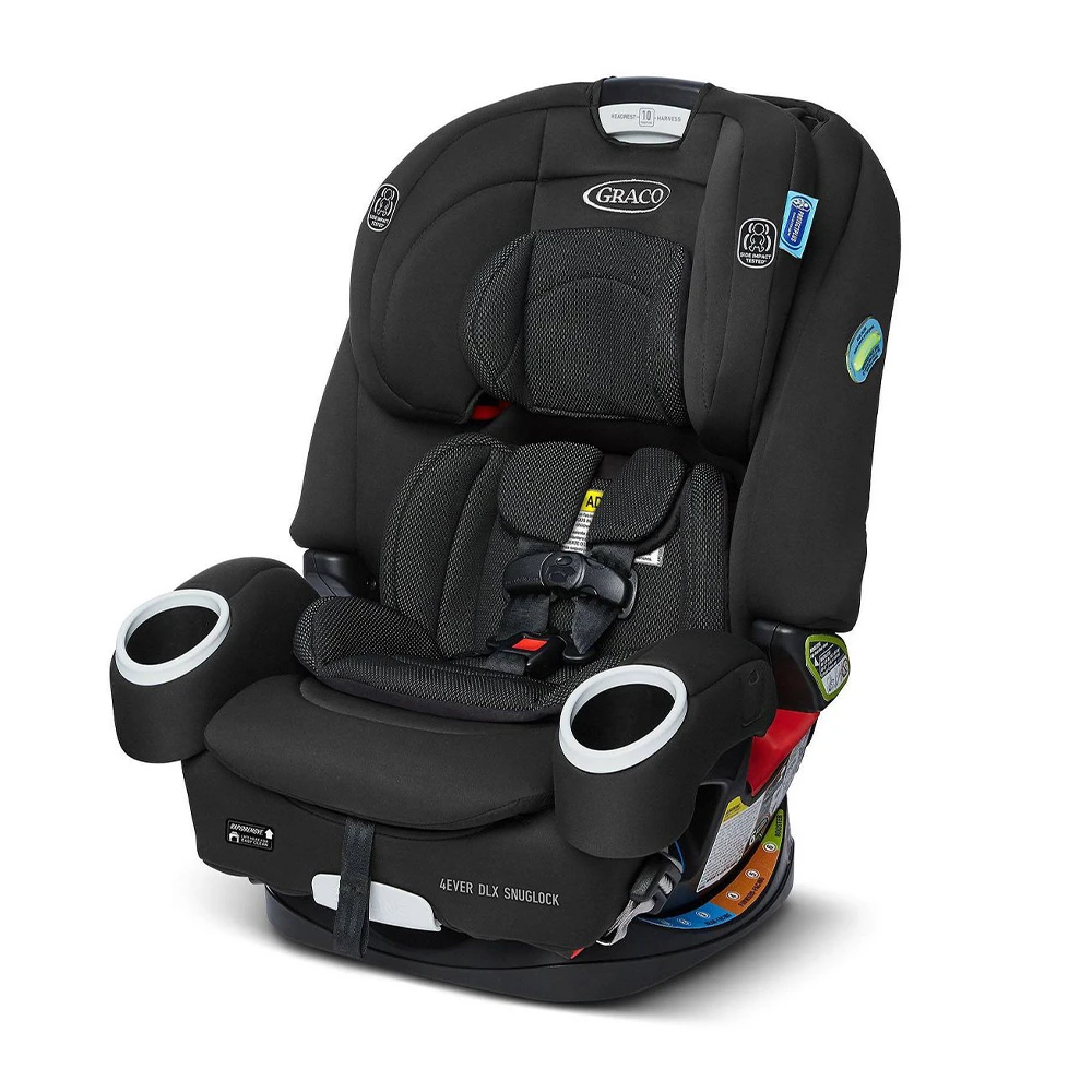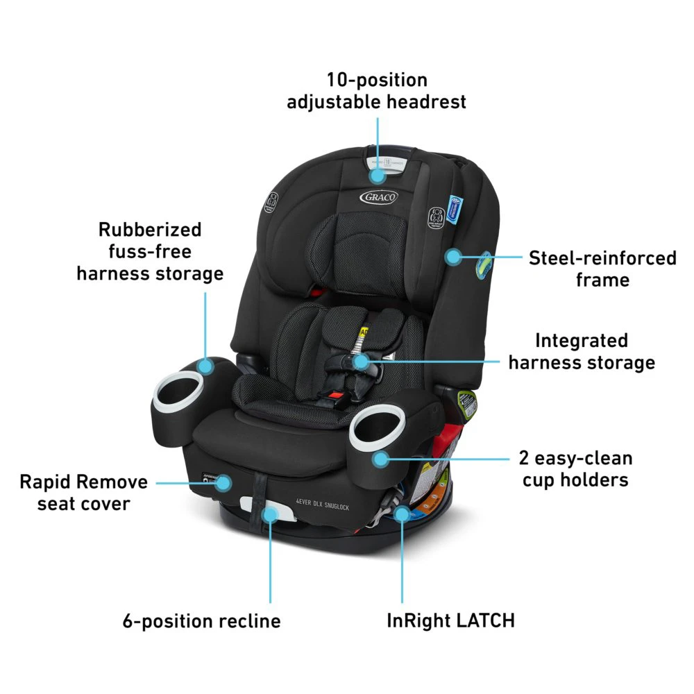 El 4Ever® más vendido que conoce y ama ahora se instala en menos de un minuto gracias a la innovadora tecnología SnugLock® usando el cinturón de seguridad del vehículo o LATCH. El sistema de arnés Simply Safe Adjust ™ No-Rethread le permite ajustar la altura del reposacabezas y el arnés con un solo movimiento para lograr el ajuste perfecto.. Botón pulsador InRight ™ LATCH, que proporciona una adjunto de un segundo con un clic audible para ayudar a garantizar una instalación segura. Reclinación de 6 posiciones se ajusta suavemente para ayudar con la instalación y mantiene a su hijo cómodo.