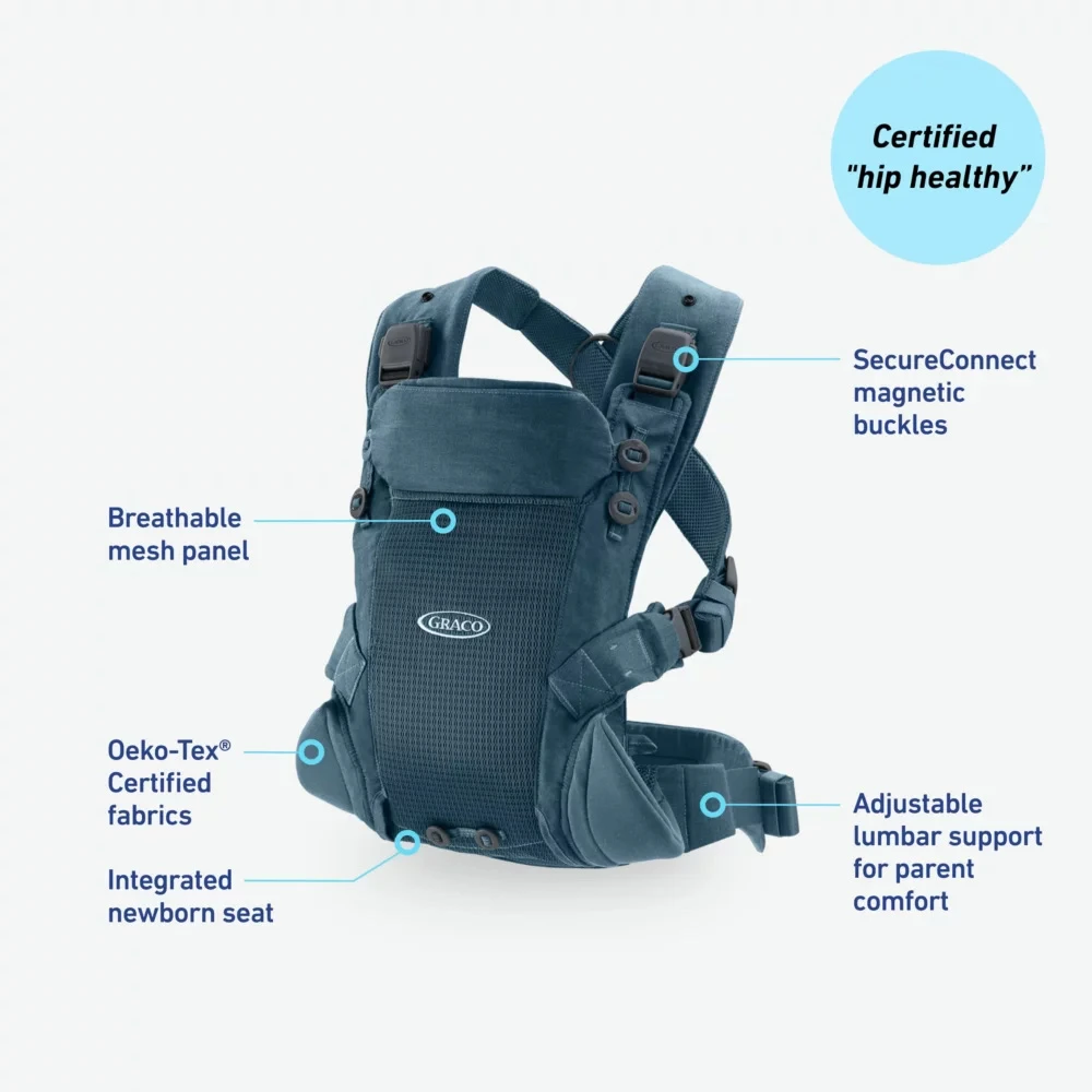 El portador de bebé Graco® Cradle Me Lite 3 en 1 tiene 3 formas de llevar al bebé, incluido un asiento para recién nacido que no requiere un inserto. Las hebillas SecureConnect utilizan imanes como guía y un pestillo seguro para conectarse, ¡lo que hace que sea fácil y seguro hacer que el bebé entre y salga!