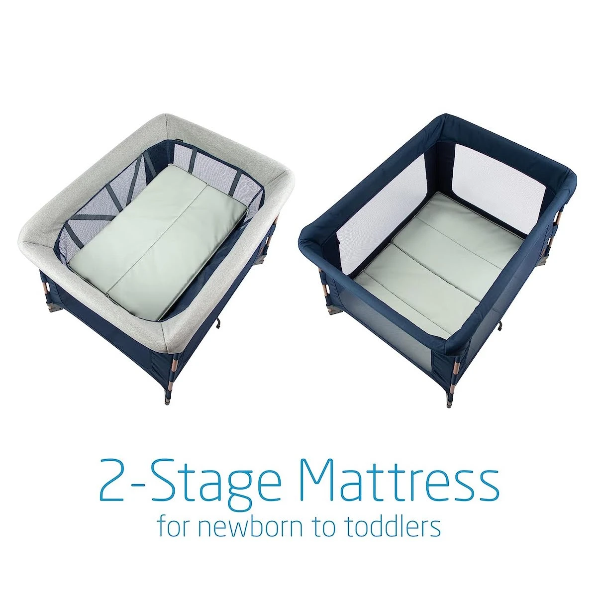 La cuna de viaje 3 en 1 tiene un único colchón para 2 etapas, que se abre para adaptarse perfectamente al moisés, lo que permite contar con un colchón más pequeño y acogedor, ideal para recién nacidos. A medida que el bebé crece, el colchón se une con cremallera creándose así un espacio más amplio y supercómodo para el tiempo de juego o para una merecida siesta.