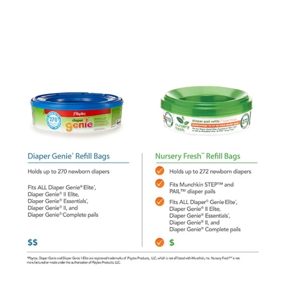 Los costos de recarga del cubo de pañales pueden sumar seriamente. Pero todavía puedes ser un genio que ahorra dinero y pañales con Nursery Fresh® Diaper Pail Refills de Munchkin. No hay razón para pagar más.