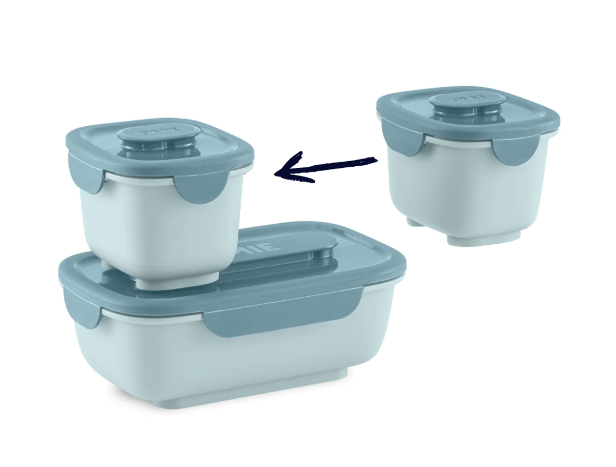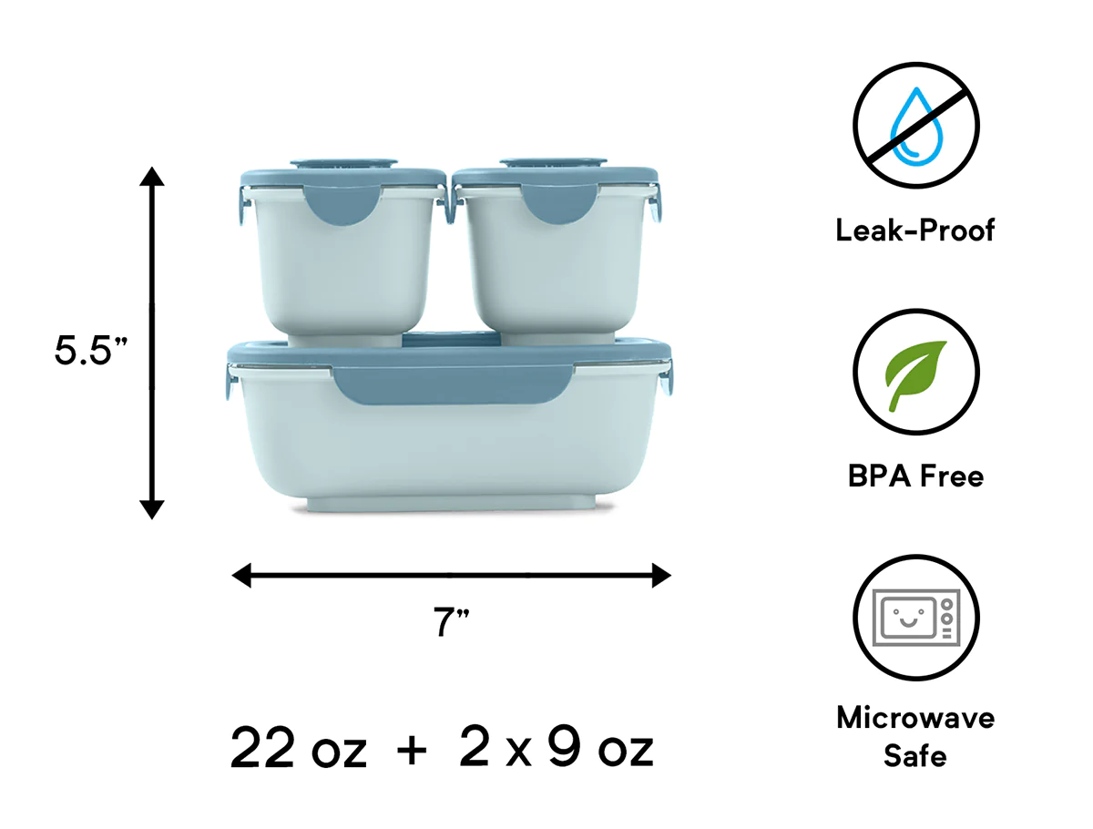 El sistema de tres piezas está diseñado para tu estilo de vida activo. Use el recipiente grande para un plato principal saludable y los dos recipientes pequeños para los bocadillos. Todos los contenedores son 100 % herméticos, por lo que sus comidas se mantienen frescas todo el día.