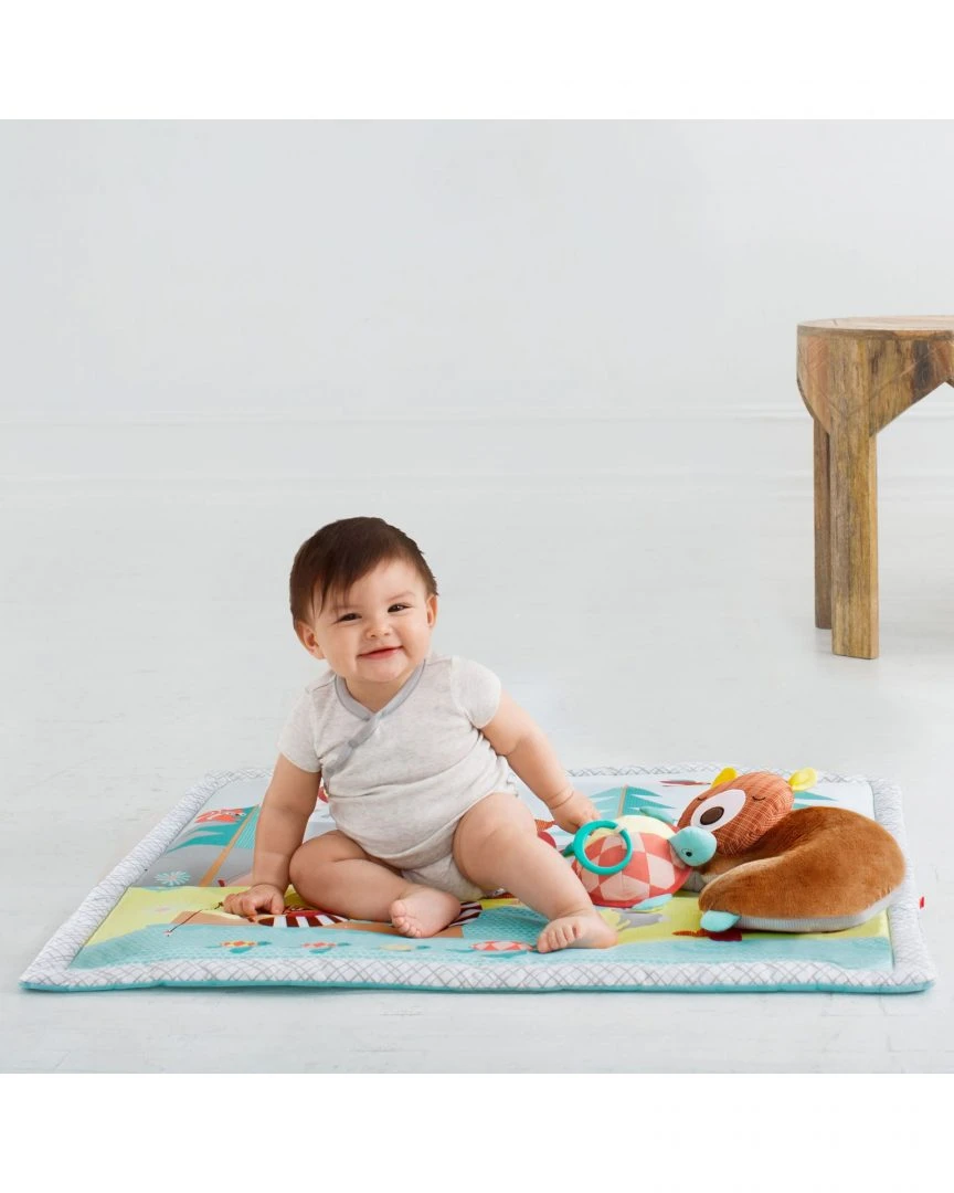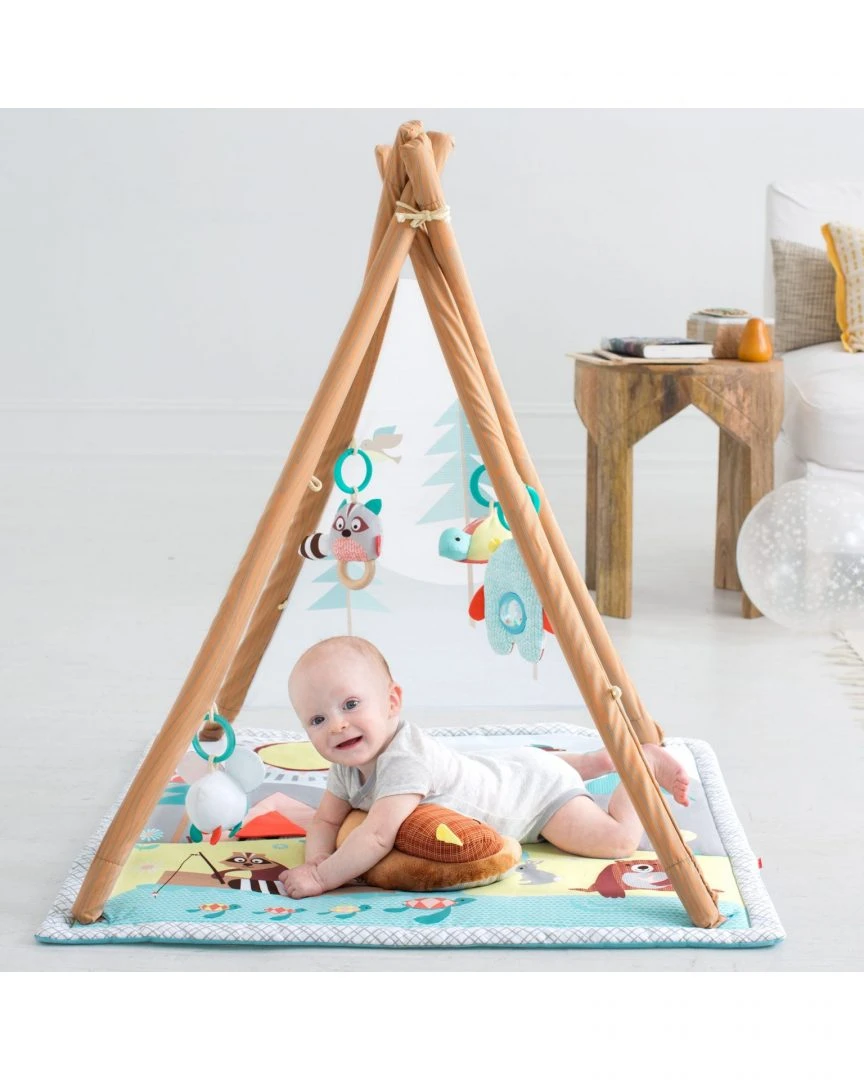 Con una estructura con diseño de teepee de vetas de madera, este gimnasio para bebés tiene una fantástica sensación al aire libre. El telón de fondo de malla impreso establece la mejor escena del campamento, mientras que la almohada de felpa y oso panza anima los hitos del desarrollo. Una luciérnaga iluminada, un mapache musical y otros amigos de la naturaleza ayudan a desarrollar las habilidades sensoriales del bebé.