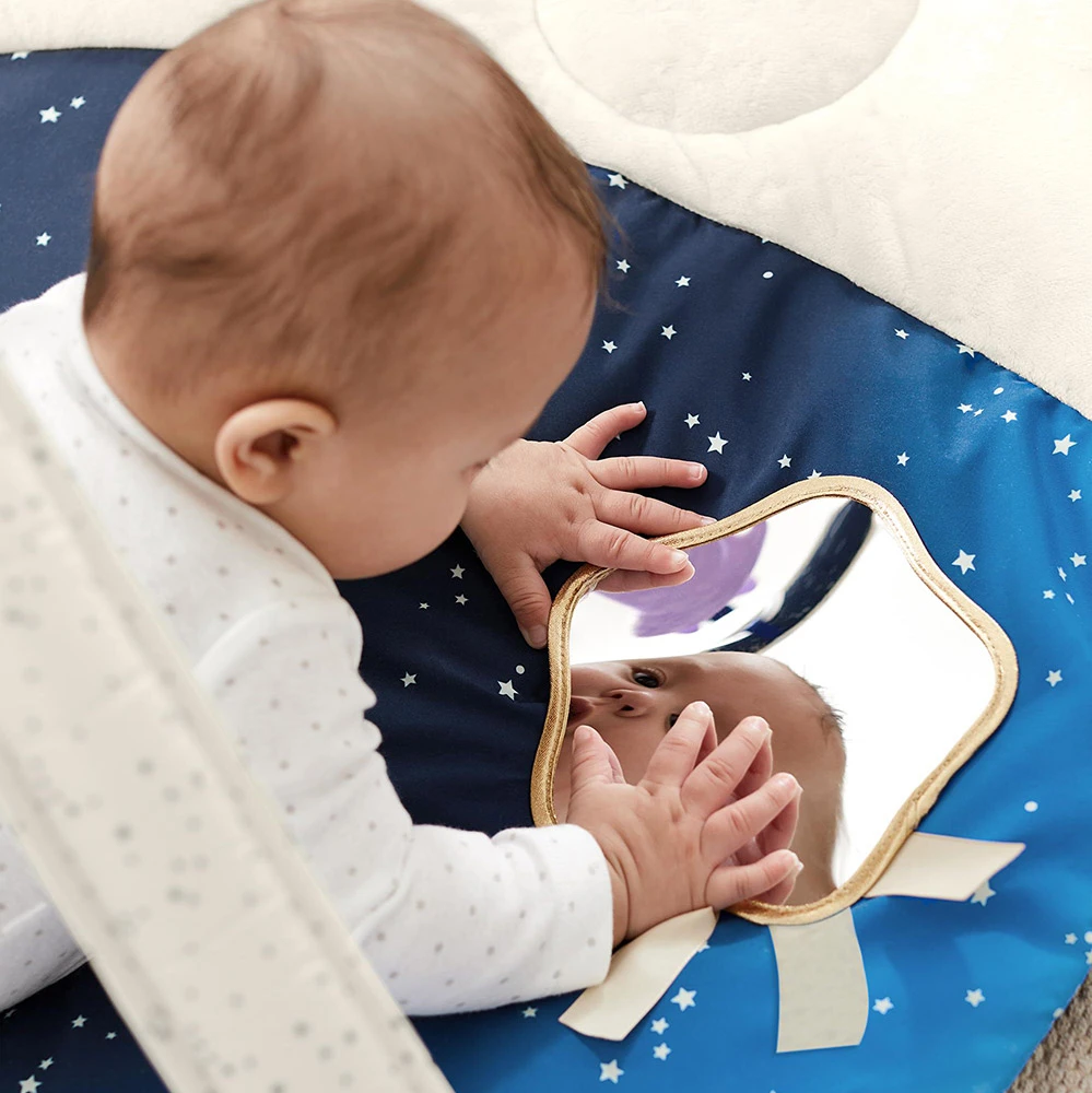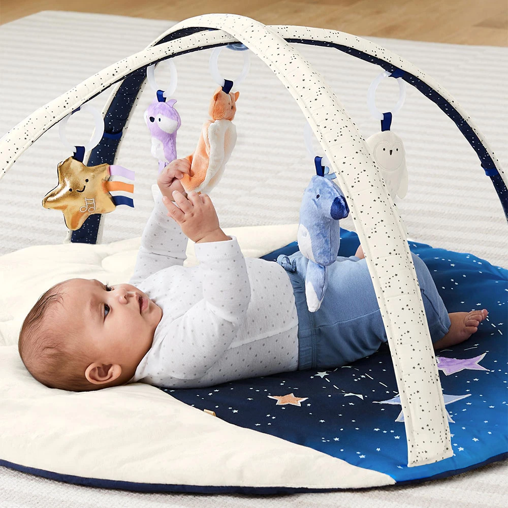 Lleno de una galaxia de diversión para el bebé, este gimnasio de actividades de ensueño cuenta con un tapete de temática celestial con detalles de acolchado de felpa y una almohada de luna creciente para jugar con el rato abdominal. Un espejo de bebé estrella fugaz extraíble fomenta el auto-reconocimiento, mientras que cinco amigos nocturnos involucran los sentidos de su pequeño con música, sonidos, texturas y más para explorar
