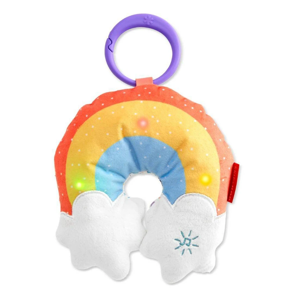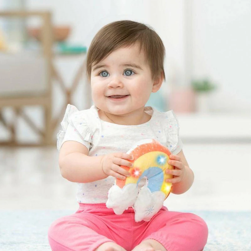 Alegre arcoíris con luces multicolor. Hecho en un material super suave y con sonidos, definitivamente llamara la atención de tu pequeño. Incluye un anillo para engancharlo en el coche, bolso o donde quieras! Las melodías se pueden prender y apagara regulando el uso de las mismas. “