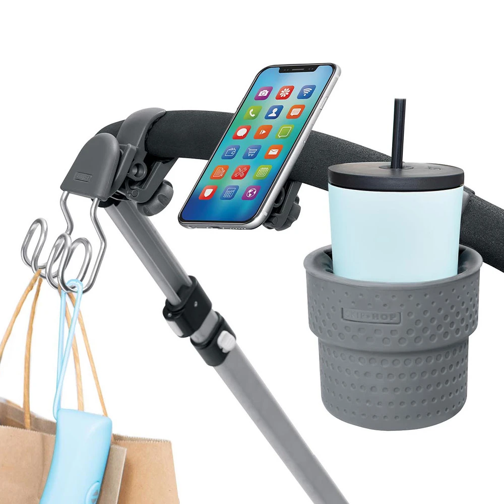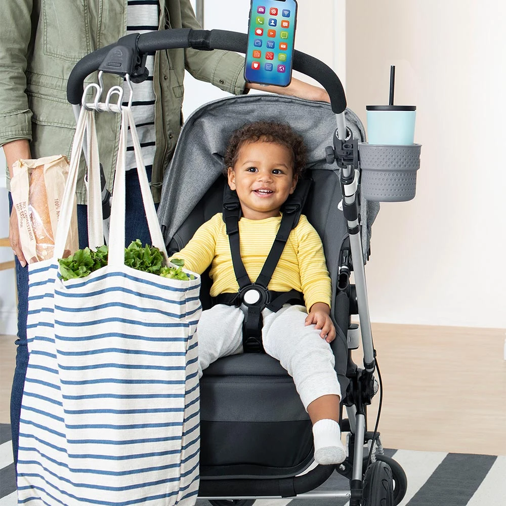 El Grab & Go Stroller Organizer de SkipHop es perfecto para llevar los productos esenciales que necesita tu bebe. Se estira para sostener botellas y tazas de café de forma segura, al tiempo que proporciona un fácil acceso a sus artículos más importantes. Esta bolsa organizadora, que se adapta a la mayoría de las barras y asas de la carriola, incluye un brazalete desmontable para hacer recados y un puerto para auriculares para llamadas manos libres.