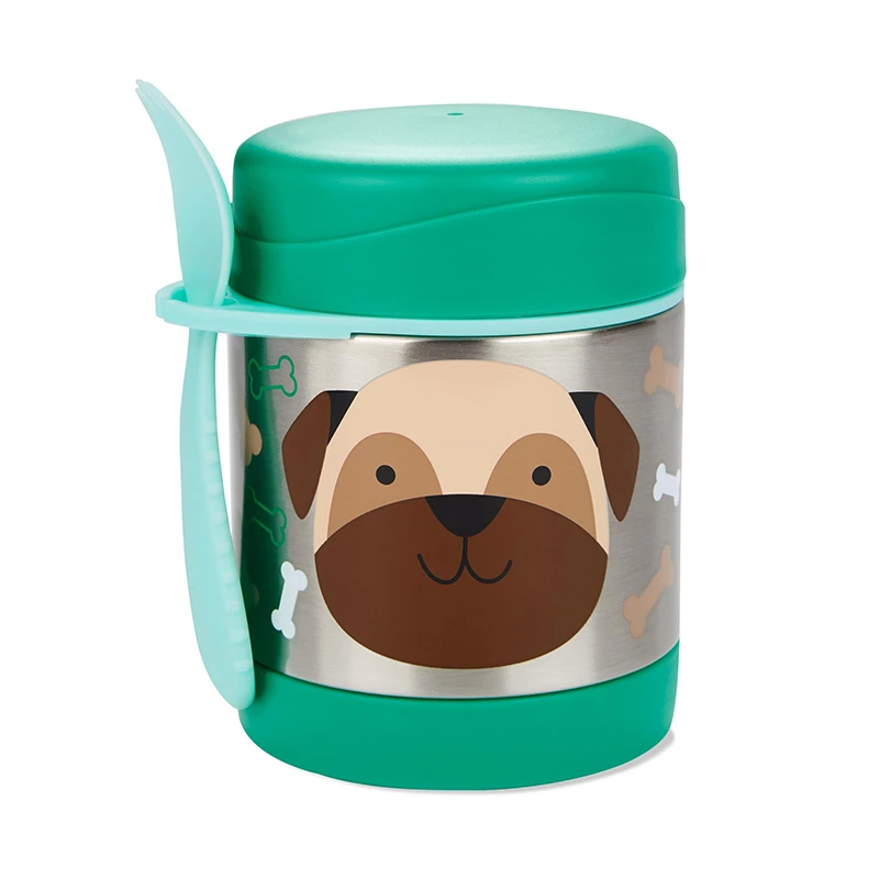El frasco aislado mantiene la comida caliente o fría, con un soporte de espolón incorporado para mayor comodidad. Hecho de acero inoxidable, este colorido contenedor es perfecto para porciones del tamaño de un niño.