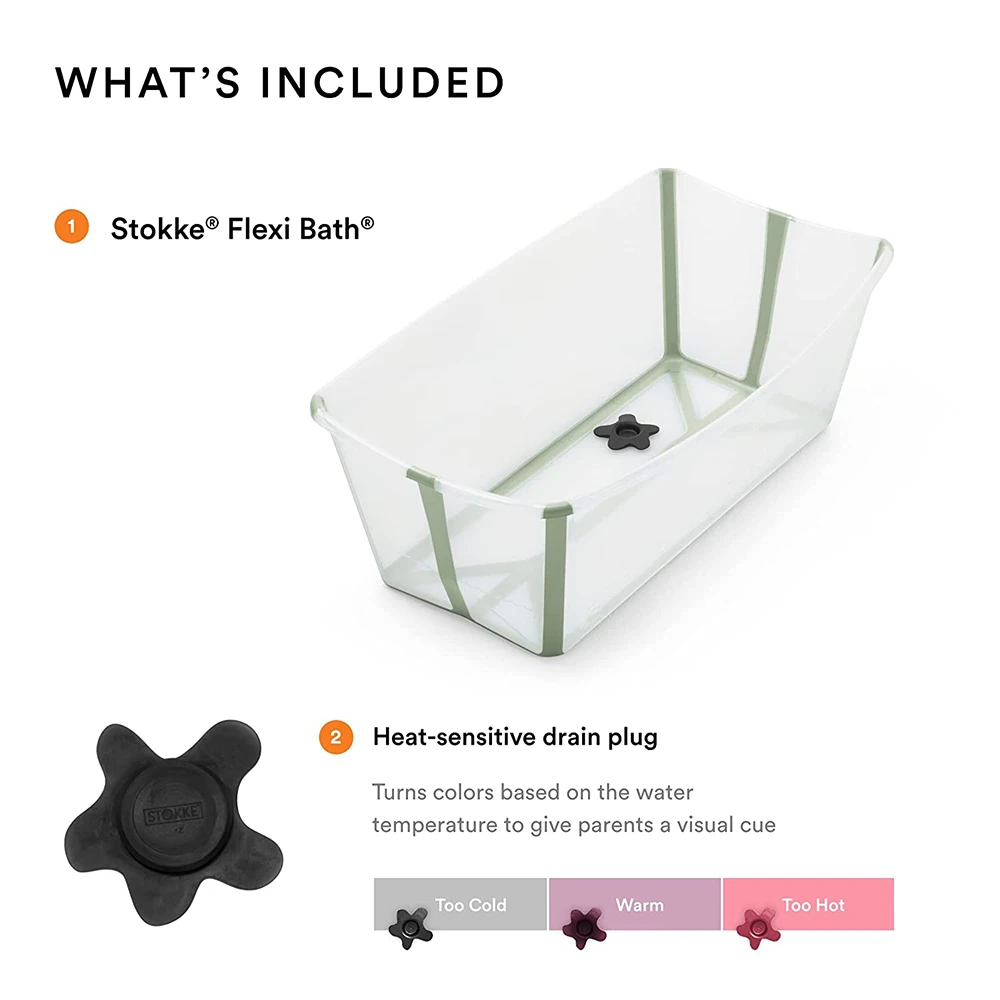 El soporte opcional para recién nacidos Stokke® Flexi Bath® proporciona comodidad adicional a los bebés recién nacidos. El tapón de drenaje sensible al calor funciona cambiando los colores, cuando el agua se calienta dando a los padres una señal visual.