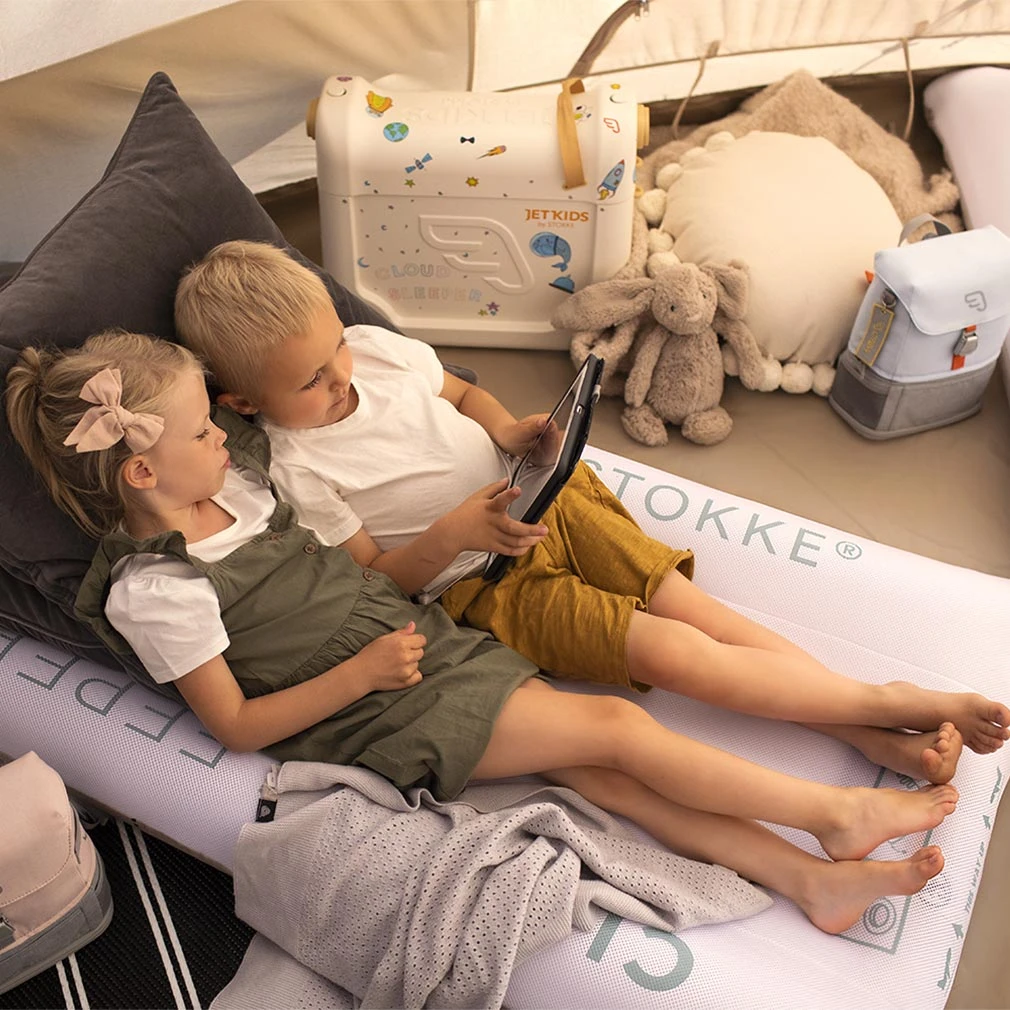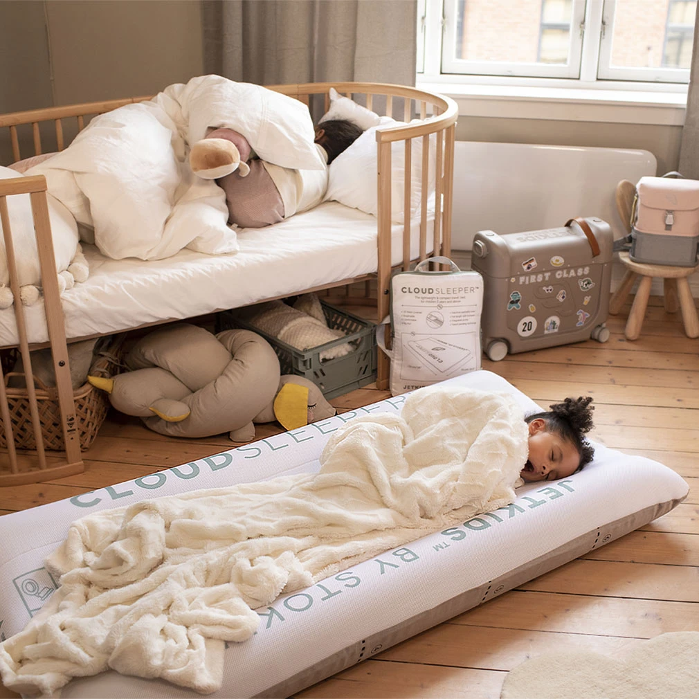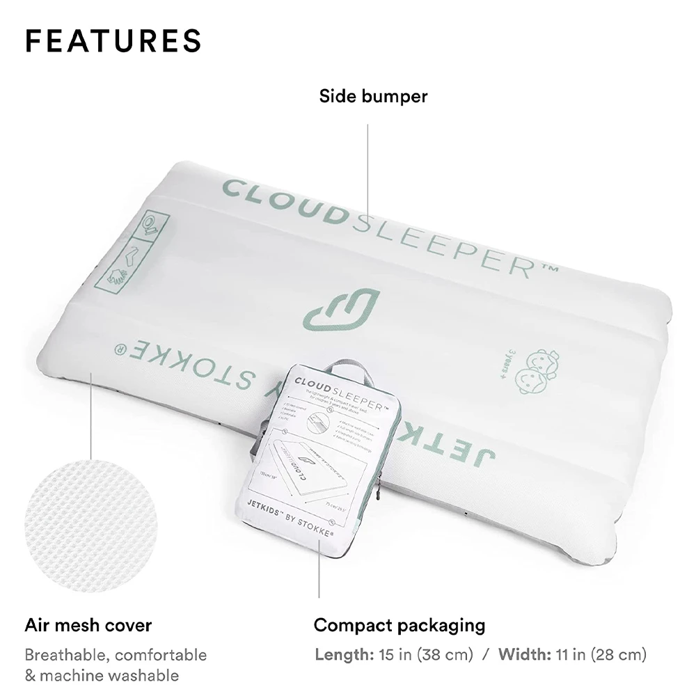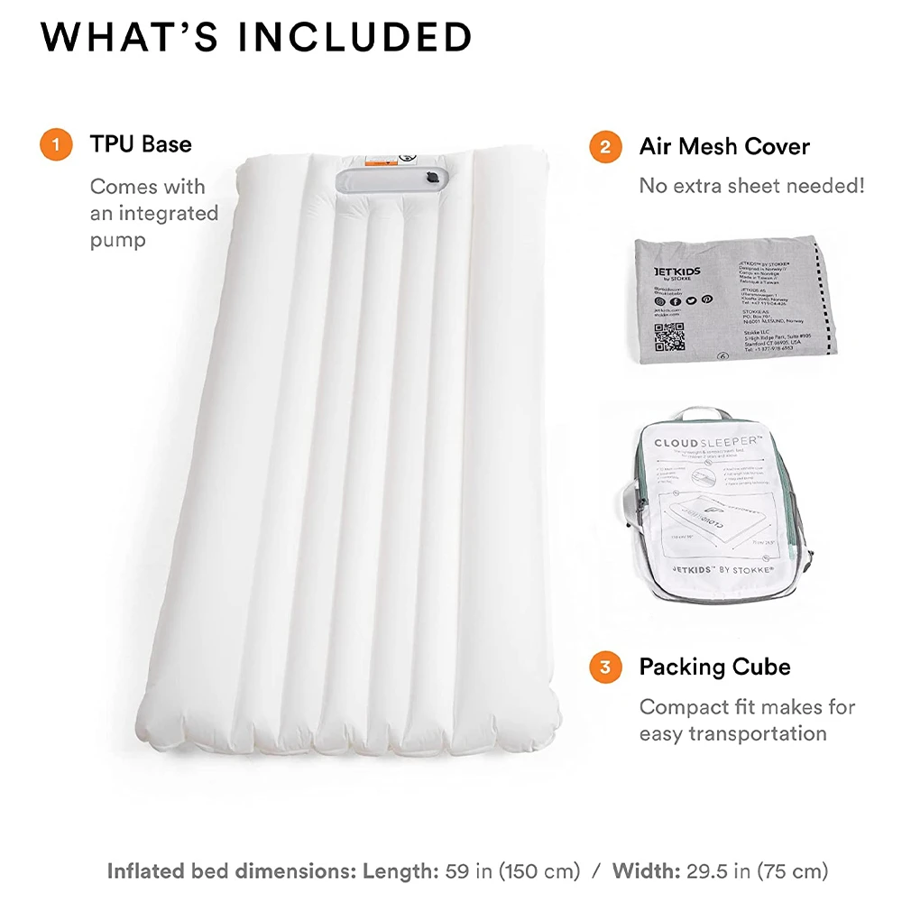 CloudSleeperTM es la cama de viaje inflable todo en uno para niños pequeños y niños de tres años o más. Es una cama de viaje fácil que es lo suficientemente pequeña como para caber dentro de tu mochila o equipaje de mano. Ligero y con todo incluido, no tiene piezas sueltas. Una verdadera innovación para las camas de viaje inflables para niños