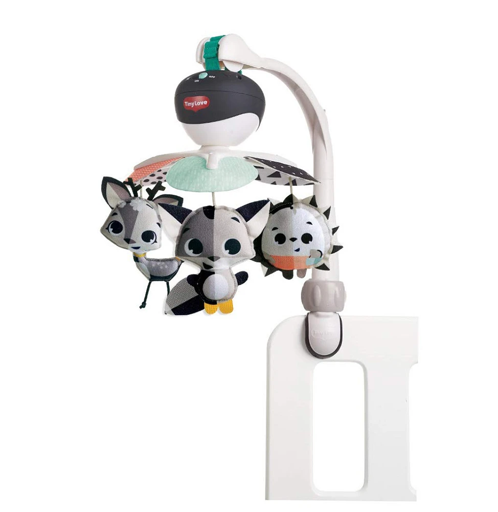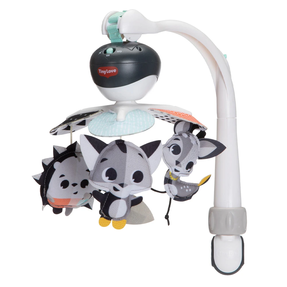 30 minutos de música ininterrumpida, con cinco melodías diferentes, calma y entretiene a tu bebé dondequiera que vayas. Los coloridos juguetes giratorios, con los personajes de Tiny Love, Christopher the Fox, Marie the Hedgehog, y Emilia the Bird, estimulan visualmente y fascinan a tu bebé.