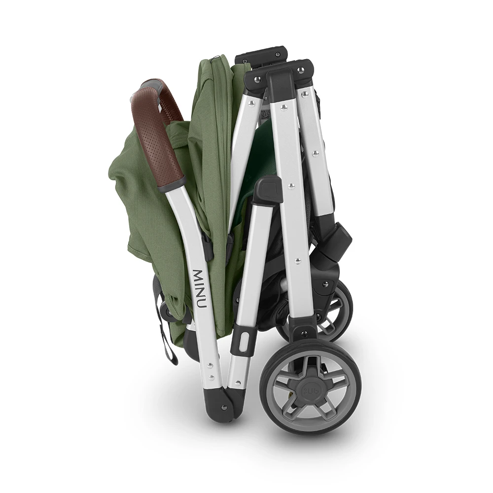 ¡Una mano y un movimiento suave son todo lo que se necesita para doblar completamente el MINU! Incluso puedes sostener al bebé en el otro brazo mientras doblas el cochecito.